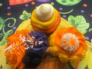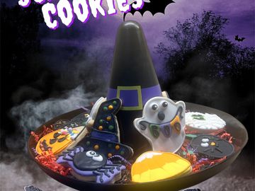 Our frightfully fun sugar cookies come served on a witch’s hat, topped with eerie designs, shimmer, and a touch of Halloween magic.