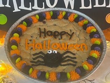 Choice of chocolate chip cookie cake with buttercream frosting OR peanut butter cookie cake with chocolate frosting is available.