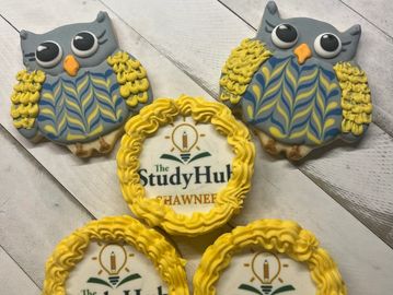 The edible image above (Study Hub of Shawnee) is made with icing sheets. Icing sheets come in 8" x 11" sheets. Images will be printed on the icing sheets with special edible ink. Please inquire for pricing.