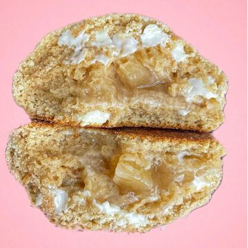 Cinnamon brown sugar dough, with crushed mini apple pies and white chocolate chips mixed in, stuffed with apple pie filling, and rolled in cinnamon sugar. 6 count - 5 ounce cookies