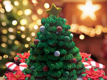 A stackable Christmas tree sugar cookie tower is a show-stopping holiday treat that doubles as a centerpiece. Made from sugar cookies cut in graduated star shapes, each cookie is baked golden, then stacked from largest to smallest to create the look of a festive Christmas tree. The layers are “glued” together with frosting, with piped details resembling snow-tipped branches. The Christmas tree is framed by candy canes and poinsettia sugar cookies.